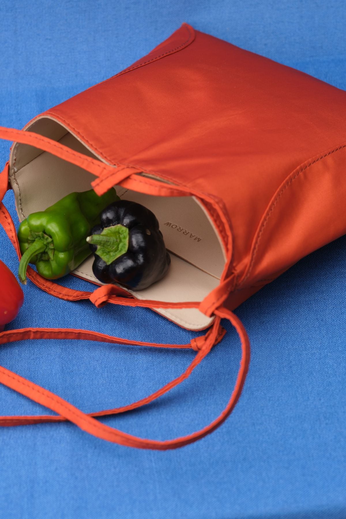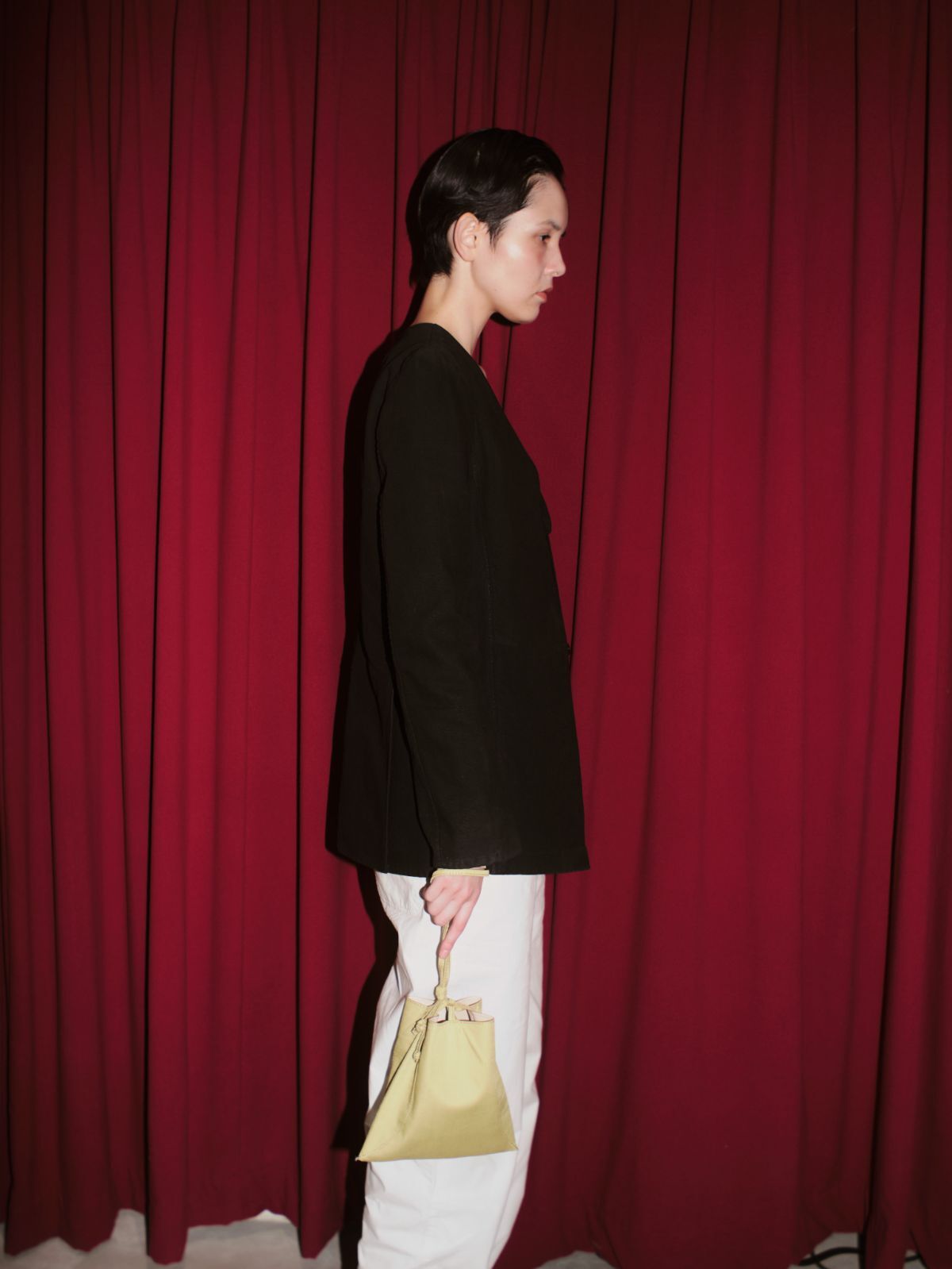 一見シンプルな巾着型だが、ピローボックスを模った独特な形状のマチがユニークなフォルムを作り存在感を放っている。