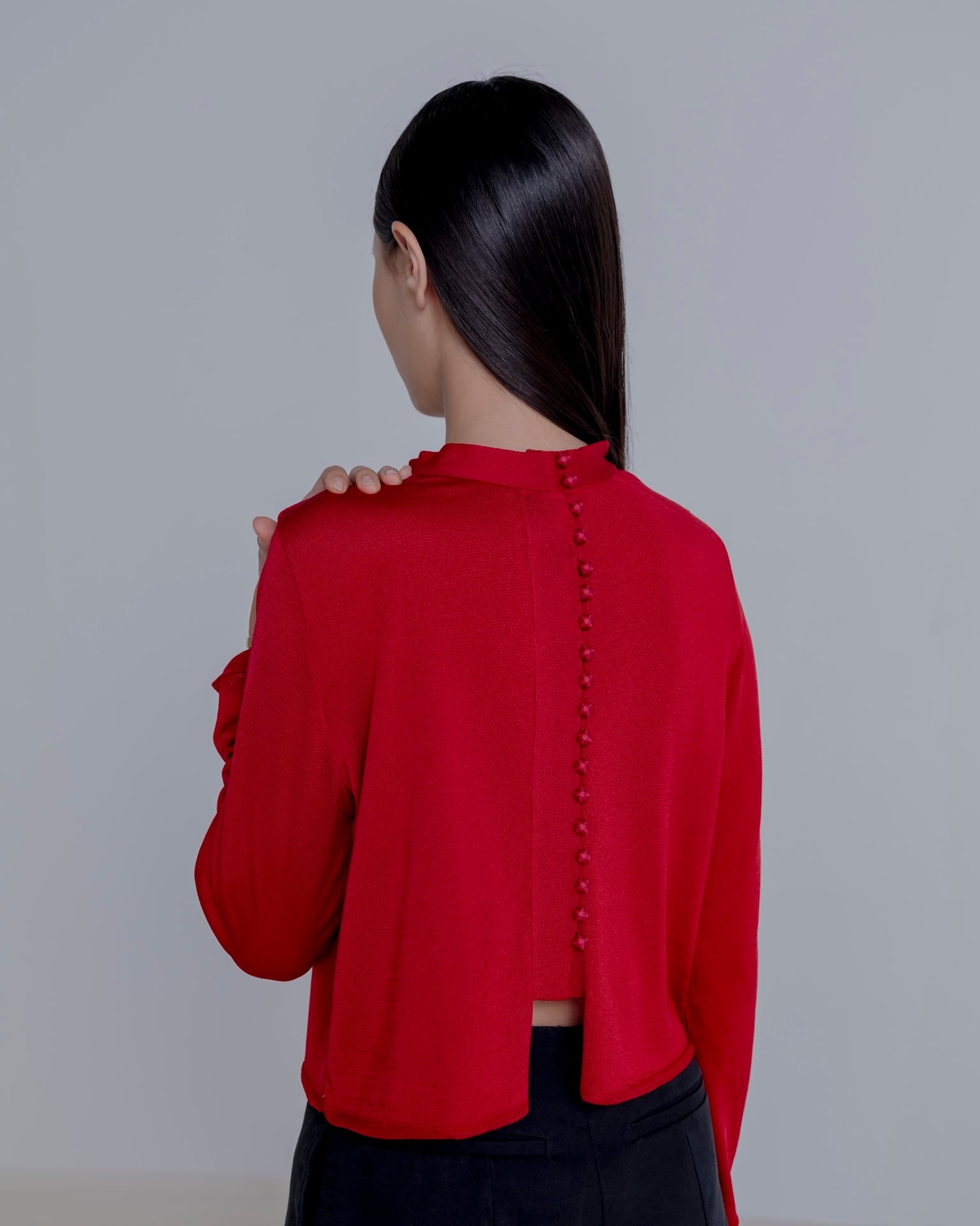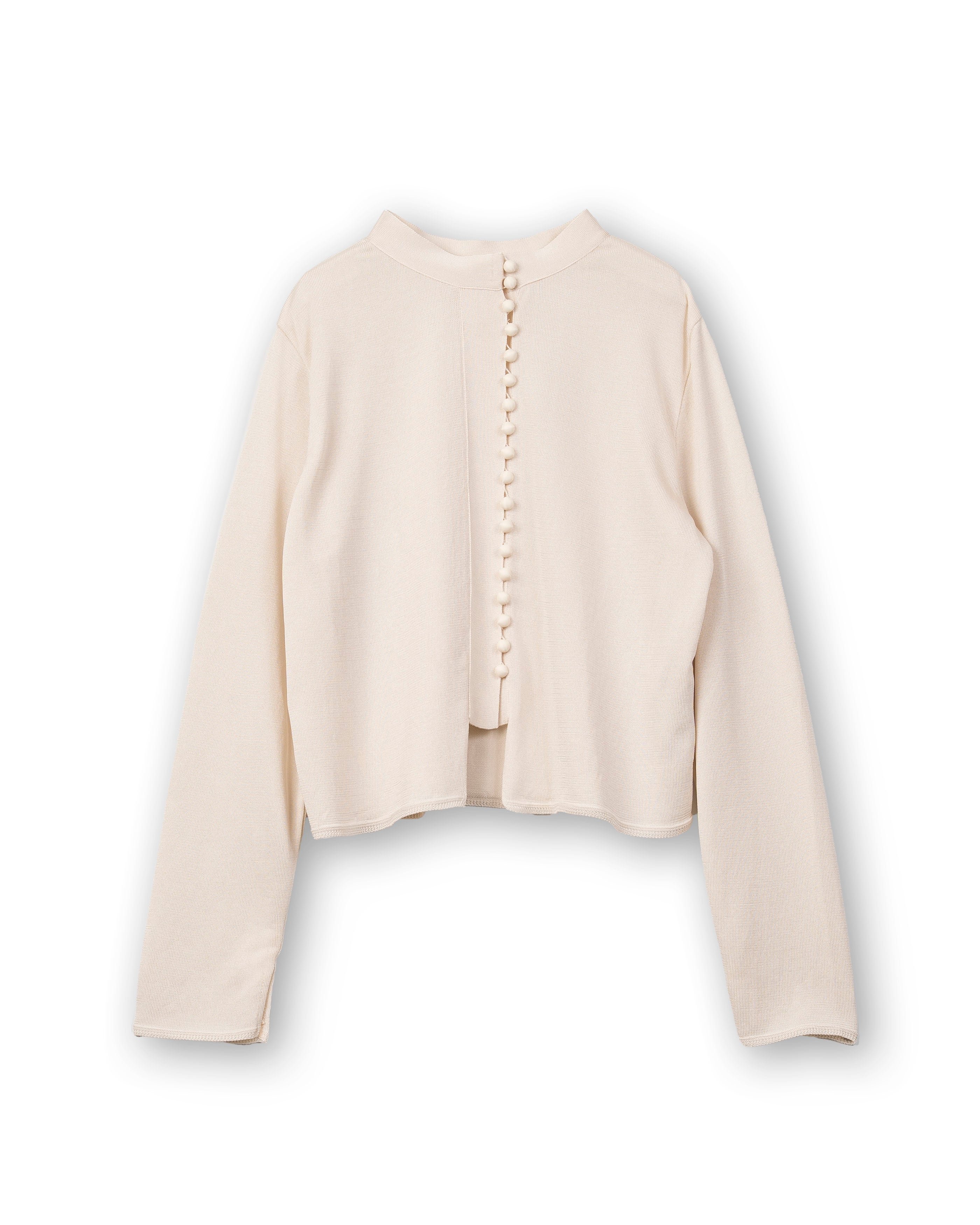 前後どちらでも着用可能で、丸みのあるサテンくるみボタンを多数配したデザインが目を引くブラウスです。